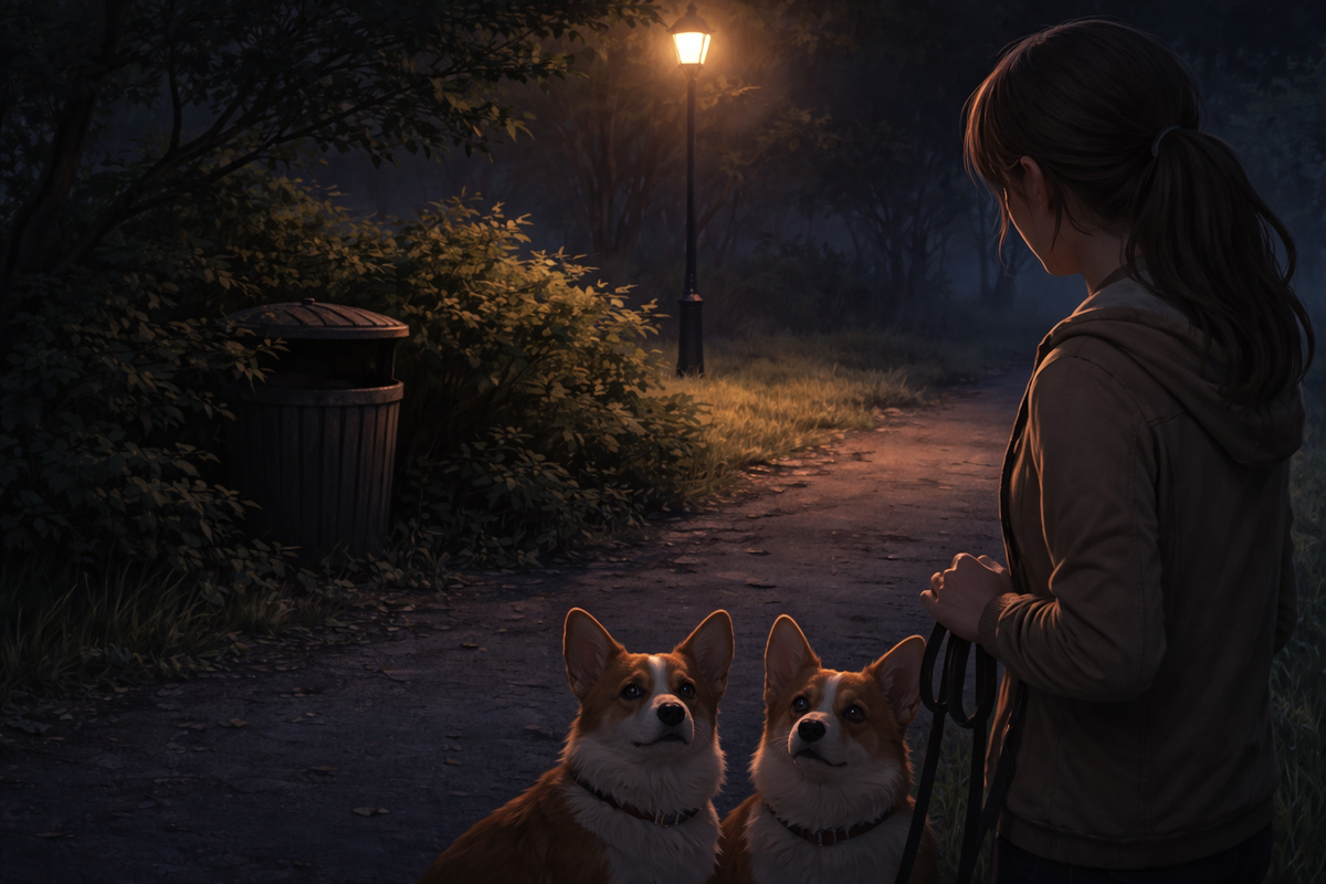 Вечерний городской парк — место, где реальность слегка сдвигается с привычных рельсов. Сумерки крадут четкость очертаний, а тишина обнажает то, что днем прячется за шумом. В такие моменты здравый смысл иногда уходит погулять, оставив нас наедине с пышно расцветающим бытовым абсурдом. День сдавал позиции, пятясь к горизонту и забирая с собой последние ясные краски. Фонари в парке ещё только раздумывали, включаться или нет. Даша вывела двух своих корги, Плюха и Бублика, на вечерний променад. Собаки, уставшие за день, шли смирно, лишь изредка поглядывая по сторонам. Мысли Дарьи витали где-то между списком покупок и отчётом, который нужно было сдать утром. Взгляд её скользнул мимо кустов у старой скамейки. И замер. В полутьме чётко читался знакомый силуэт: приземистый корпус, короткие лапы, характерный наклон головы — Бублик! И он явно был чем-то увлечён, что-то жадно подбирал с земли. — Бублик! — рявкнула Даша. — Ко мне! Сию секунду! Силуэт в кустах не шелохнулся. Плюх и настоящий Бублик