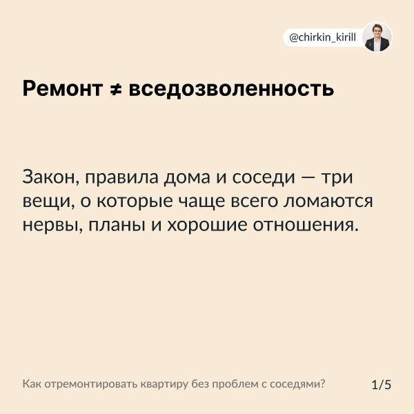 ? В дополнение к предыдущей публикации ловите сводные карточки про проведение ремонта в квартире. Поделитесь ими в своей группе дома, друзьями или коллегами. Относитесь с уважением к соседям и дому, и они будут вам рады! Кирилл Чиркин