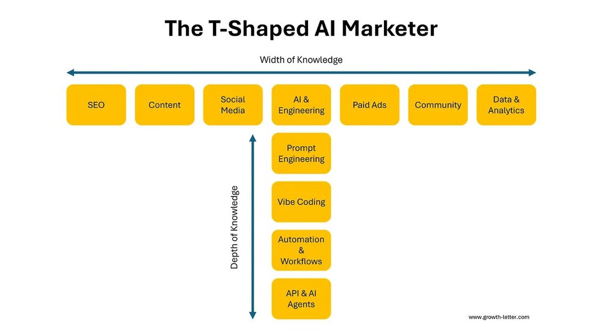 Появляется новый стандарт профиля, который может заменить целую маленькую команду в стартапе — «T-shaped AI маркетолог». Это не просто человек, который шарит во всех каналах, а тот, кто умеет управлять AI-агентами, строить автоматизации и писать такие prompts, от которых система реально выполняет работу, а не генерит пустые тексты. Такой маркетолог знает чуть-чуть всего и глубоко по ключевым вещам: prompt-engineering (это сердце AI-workflow), vibe-coding (умение быстро собирать лендинги/эксперименты без вечного ожидания от девов) и автоматизацию процессов через Make, Zapier или n8n, чтобы не сидеть в ручной рутине. Че думаете - булшит и карго-культ или вы уже реально только таких нанимаете? https://bit.ly/45EDV1R Там еще веселая стата про ии будет в следующем посте.