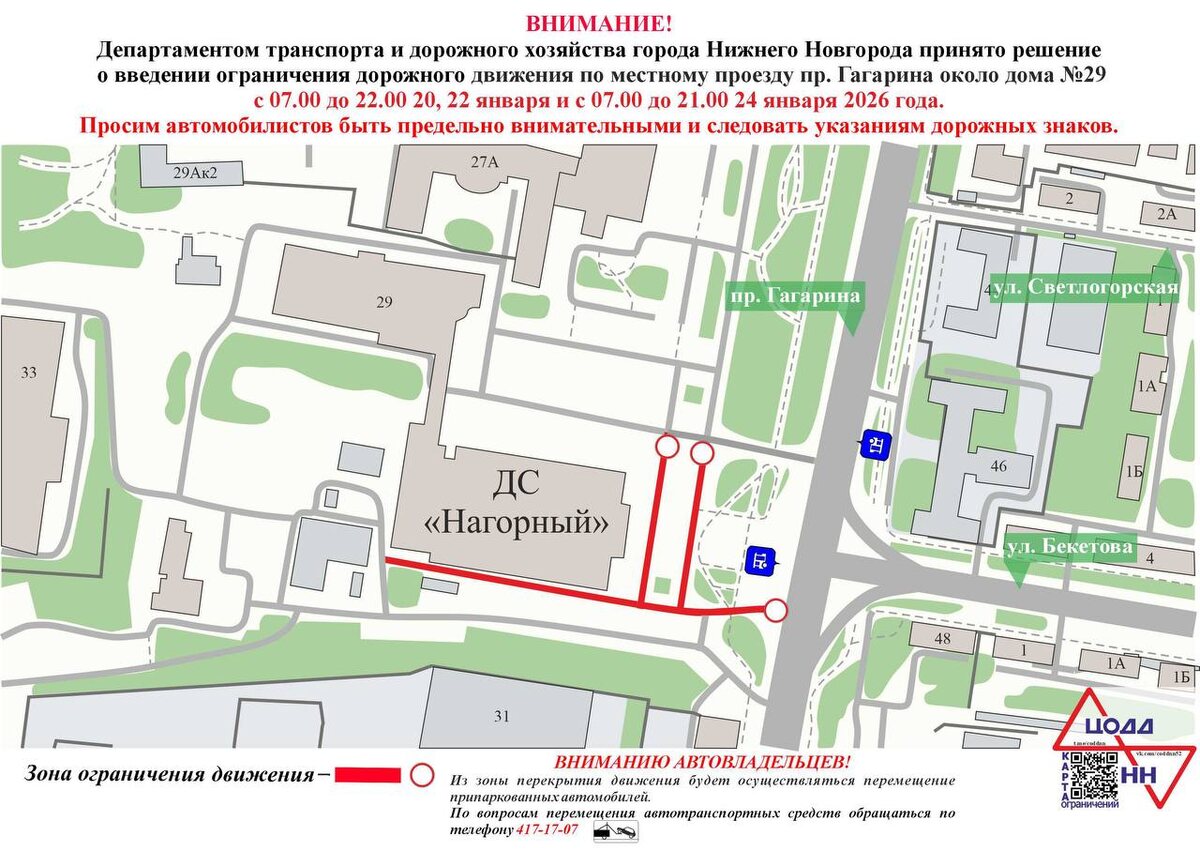 В Нижнем Новгороде 20, 22 и 24 января будет временно ограничено движение транспорта по местному проезду проспекта Гагарина в районе дома №29. Ограничения связаны с проведением спортивных матчей и вводятся в целях обеспечения безопасности участников и зрителей мероприятий. Движение будет закрыто 20 и 22 января с 07:00 до 22:00, а также 24 января 2026 года с 07:00 до 21:00. Речь идет именно о местном проезде вдоль проспекта Гагарина рядом с домом №29, где традиционно концентрируется транспортный поток в дни массовых событий. Городские службы просят автомобилистов заранее переставить машины за пределы зоны действия ограничений. Транспортные средства, оставленные в запрещенной зоне после начала ограничений, подлежат принудительному перемещению на специализированную стоянку. Получить информацию о местонахождении эвакуированного автомобиля можно по телефону справочной службы 417-17-07. На участке будут установлены временные дорожные знаки и ограждения, а также организовано дежурство сотрудни