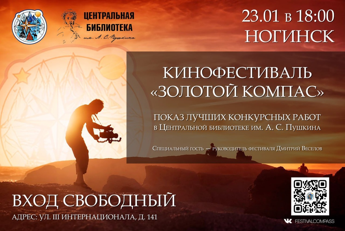 ! Впервые в Ногинске! Российский фестиваль кино- и фоторабот «Золотой компас» приедет с показом лучших конкурсных фильмов. В пятницу, 23 января, в Центральной библиотеке имени А. С. Пушкина состоится бесплатный кинопоказ, посвящённый спортивному туризму, экспедиционной деятельности и путешествиям. Вы увидите вдохновляющие авторские видеоработы разных форматов и жанров, раскрывающие красоту природы, эмоции и переживания участников восхождений и сплавов. Специальные гости кинопоказа — руководитель фестиваля Дмитрий Веселов и неоднократный призёр «Золотого компаса» Сергей Марченко. ⏰ 23 января в 18:00 📍 г. Ногинск, ул. III Интернационала, д. 141 Показ проводится по инициативе члена Союза журналистов Артура Ласкова. Информация для СМИ: @arturlaskov_sensei Подписаться | Предложить новость