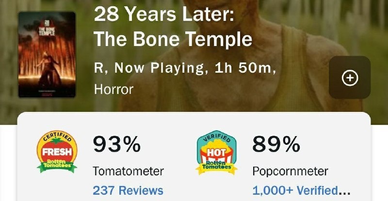 Фильм внезапно оказался люто ГОДНЫМ: «Храм Костей» собрал 93% свежести на Rotten Tomatoes и 7,8 на Metacritic — лучший результат за всю историю франшизы. 🔴 Обозреватели отмечают: кино получилось мрачным, эмоционально давящим и предельно ЖЕСТОКИМ. 🔴 Часть критиков уверена, что сиквел вышел смелее, кровавее и глубже оригиналов Дэнни Бойла. 🔴 Отдельно хвалят актёрскую игру Рэйфа Файнса и Джека О’Коннелла, тревожный саундтрек и меткий чёрный юмор. Сеансы сами себя не посмотрят. Подробнее: https://hard-tm.su/threads/141463/ 🕹HARD-TM — Подписаться
