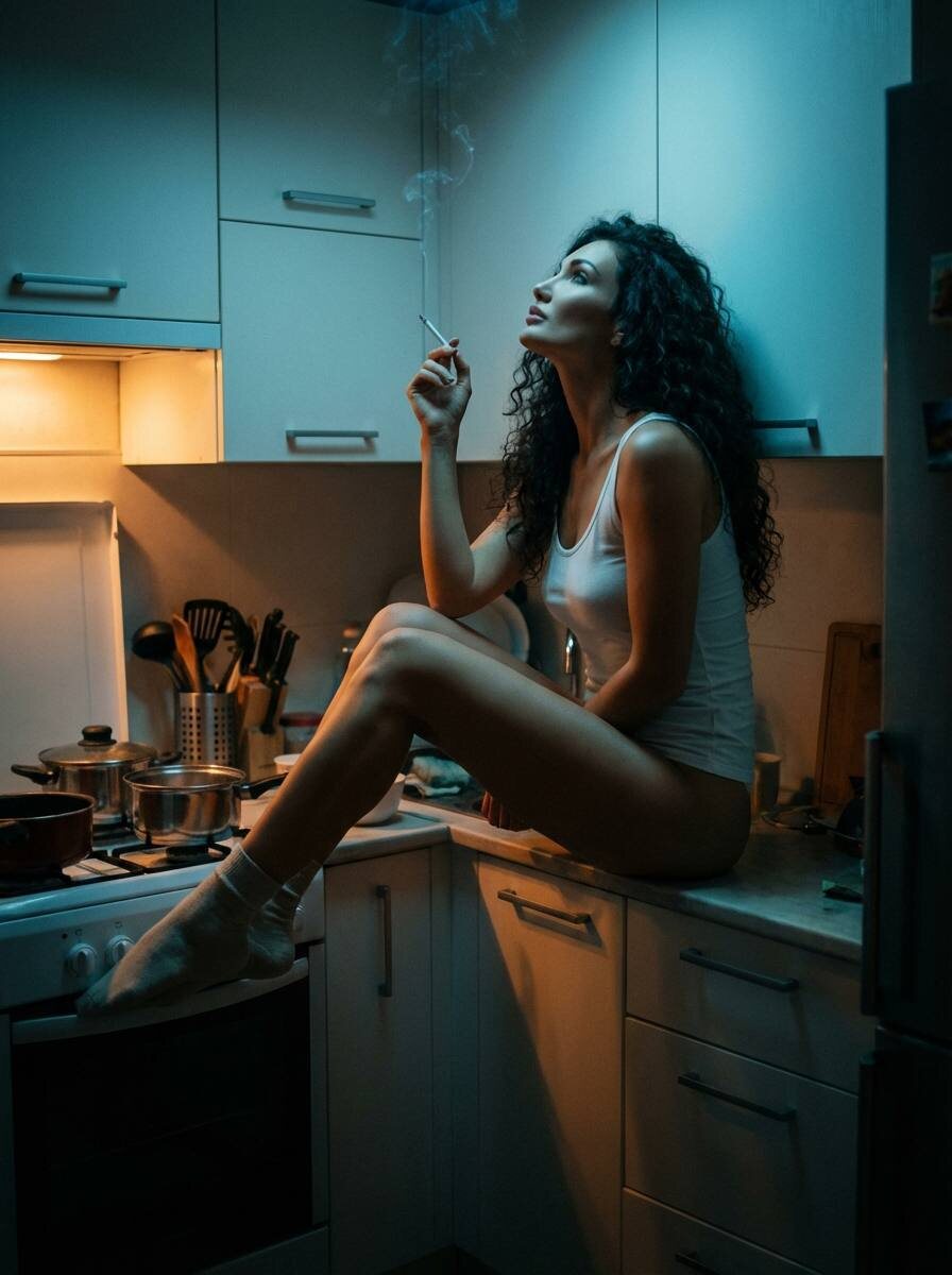 Фото 3:4. Кинематографичный и глубоко атмосферный портрет молодой женщины, сидящей на кухонной столешнице в полумраке. Снимок выполнен в эстетике современного нуара или «одиночества в большом городе», где главную роль играет контраст теплого и холодного освещения. Детализация для нейросети • Композиция и поза: Девушка сидит на краю столешницы, поджав колени к груди и обхватив их руками. Она запечатлена в профиль, голова слегка запрокинута вверх, взгляд направлен в пустоту. В одной руке она держит тонкую дымящуюся сигарету. Поза выражает задумчивость, усталость или меланхолию. • Освещение (Ключевой элемент): Сложное смешанное освещение. Сверху и сбоку на персонажа падает холодный ярко-голубой свет, подчеркивающий контуры тела и волос. В то же время снизу (из-под кухонных шкафов) идет мягкое, насыщенное золотисто-оранжевое свечение, которое создает глубокие тени и теплые блики на коже. • Персонаж: Молодая женщина с длинными волосами. Она одета в простую белую майку и светлые носки. • Ок