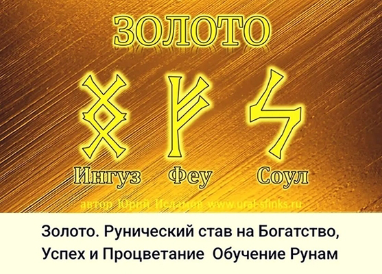 Оговор: «Данная руническая формула настраивает меня на денежный лад, активирует состояние денежного золотого человека. Всё, к чему я прикасаюсь и о чём думаю – превращается в золото, монетизируется в деньги. Я полноценно реализую свой денежный потенциал и живу в золоте и роскоши, получая удовольствие от своей деятельности и самовыражения. А также включает во мне творческий генератор денег, который как печатная денежная машина материализует деньги всё больше и больше. Каждая моя мысль и каждое моё действие материализуется в ощутимый финансовый эквивалент, в деньги, золото и материальное богатство. Так есть».