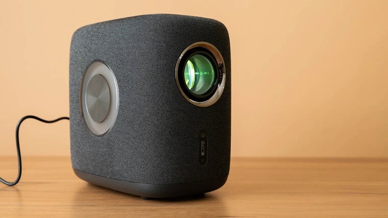 Основную часть корпуса данного проектора покрывает тканевый материал, который обеспечивает тактильно приятную поверхность и придаёт устройству более премиальный внешний вид. Остальные элементы выполнены из тёмно-серого пластика, создавая с тканевой отделкой контрастные акценты и общую визуальную выразительность.