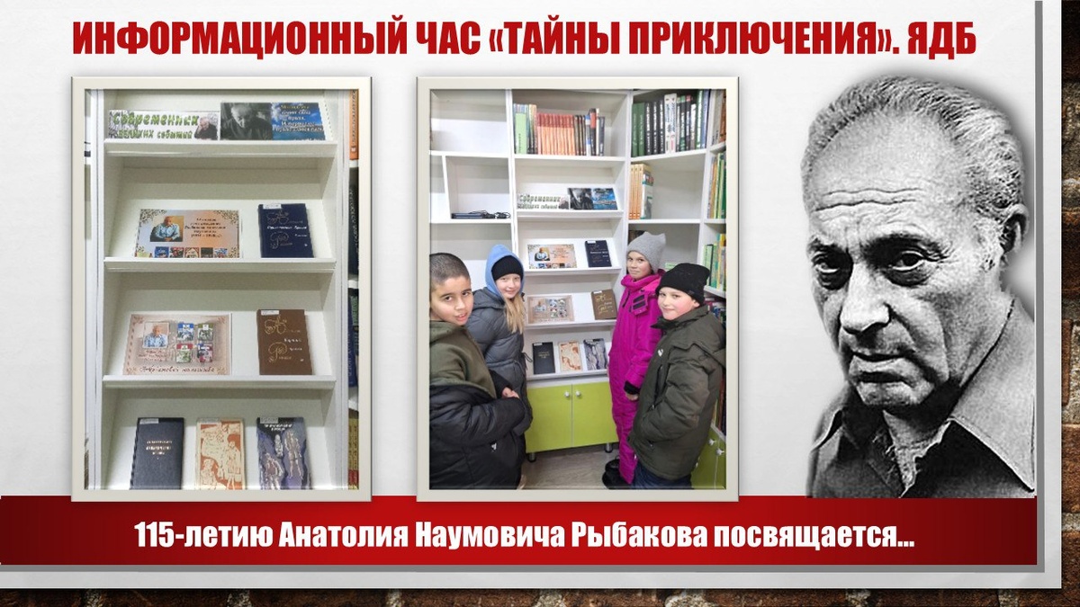 Рыбакова, в честь 115-летия которого в библиотеке была оформлена выставка «По страницам произведений», и проведён её обзор. Ребята познакомились с жизнью и творчеством писателя. Им рассказали, что Анатолий Наумович прожил непростую, насыщенную событиями жизнь: работал грузчиком, шофёром, был репрессирован. Прошёл всю войну от Москвы до Берлина. Литературное творчество он начал лишь в 37 лет. «Кортик» и «Бронзовая птица» — это два самых известных произведения Анатолия Рыбакова, который стал одним из классиков отечественной подростковой литературы. Третья повесть цикла — «Выстрел» — известна меньше, но именно она является более зрелым произведением, посвящённым судьбе тех же героев. Почти все произведения писателя были экранизированы.