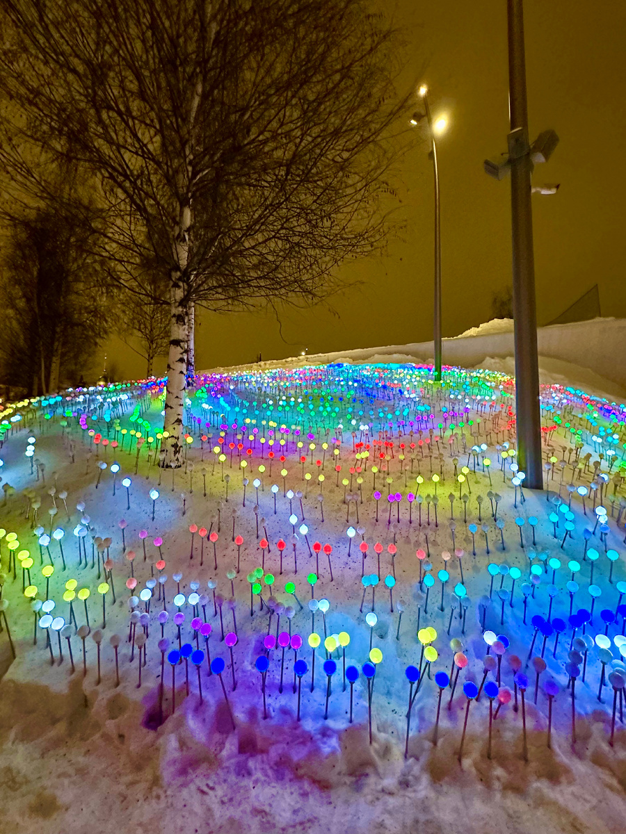 Вечером в парке красиво есть целые светящиеся неоновыми огоньками поляны.