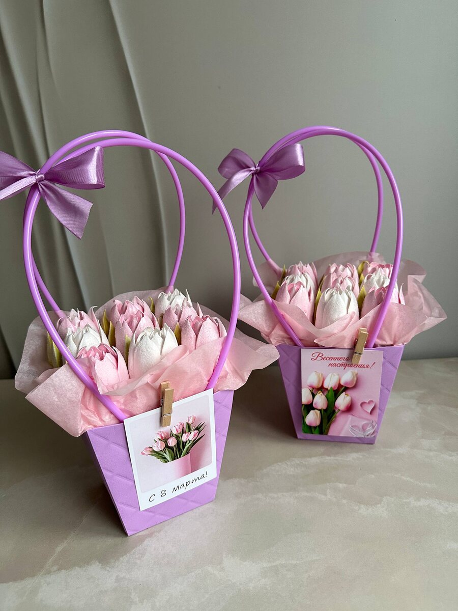 ‼️После 15 февраля стоимость увеличится. Сверху прозрачная пленка. На 8 марта - цвета сумочек в ассортименте без возможности выбрать (бирюза, розовый, сиреневый). Цвет тюльпанов - розовобелый, как на фото. Открытка в подарок Запись на 8 марта открыта