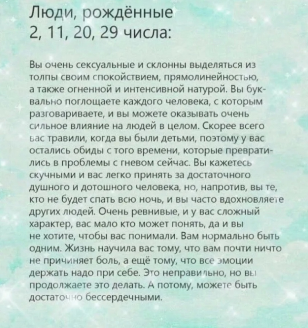 · 29 (2+9=11; 1+1=2, но путь через 11) — здесь ключевой момент! Это число считается одним из путей к мастер-числу 11. Человек с числом 29/11 несет в себе как качества миротворческой и чувствительной Двойки, так и мощную, интуитивную и часто напряженную энергию Мастера-11.