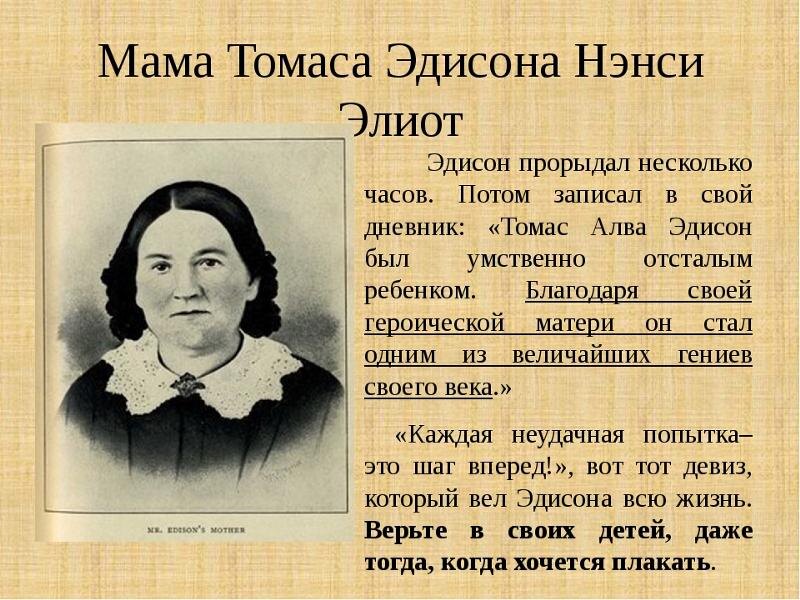 Томас Эдисон действительно был необычным ребёнком, однако мать смогла превратить его «недостатки» в преимущества: