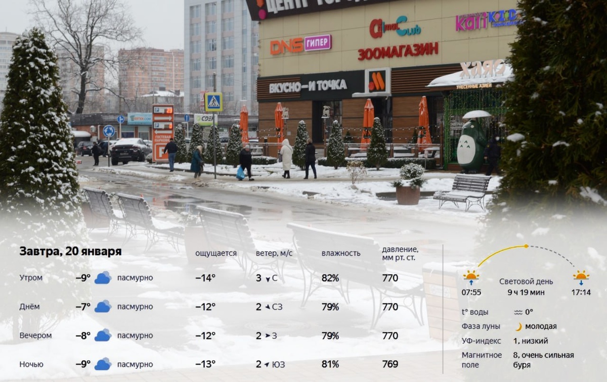 Во вторник, 20 января, в Краснодаре ожидается морозная и пасмурная погода. Утром около −9°, по ощущениям значительно холоднее. Днём температура поднимется до −7°, существенных изменений не ожидается. Вечером и ночью мороз усилится до −8…−9° при слабом ветре и плотной облачности. Световой день составит 9 часов 19 минут, восход в 07:55, закат в 17:14. Температура воды 0°, УФ-индекс низкий, ожидается очень сильная магнитная буря. Подробнее: https://краснодарскийкрай.рф/news/prognoz-pogody-v-krasnodare-na-20-janvarja-2026-goda.html Прогноз погоды на неделю: https://краснодарскийкрай.рф/pages/weather-forecast.html #погода #прогнозпогоды #температура #осадки #ветер #климат #метеопрогноз #краснодар #краснодарскийкрай