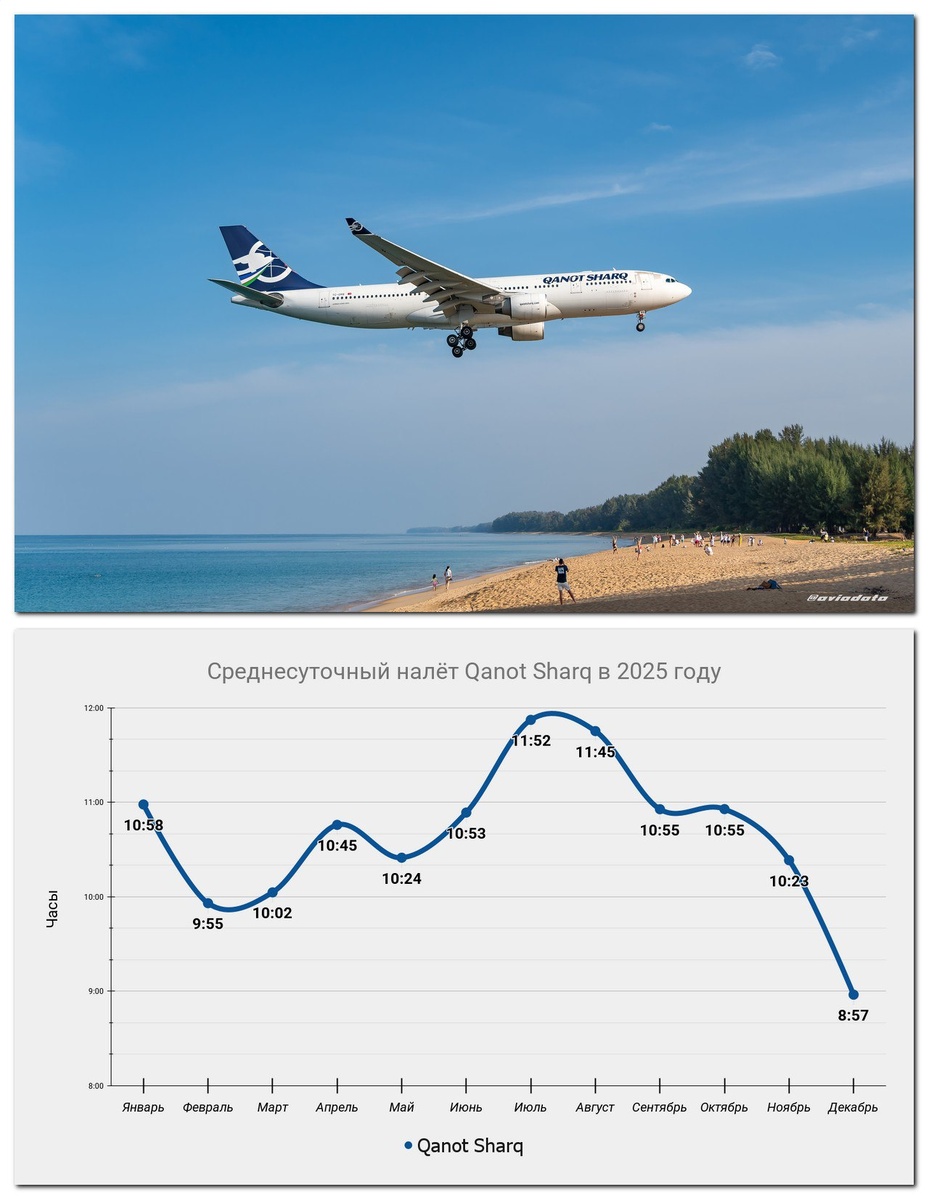 В 2025 году общий налёт самолётов авиакомпании составил 23621:12 часов. Из них налёт по типам самолётов составил: А320 - 8789:55 часов, А321 - 10101:20 часов, А330 - 4729:57 часов. Как менялся среднесуточный налёт в течении года показано на графике. Флот авиакомпании в декабре 2025 пополнился самолётом Airbus A321XLR - UK32112. Таким образом авиакомпания стала первым эксплуатантом данной модификации в Центральной Азии и СНГ. #статистика #qanotsharq #итоги2025