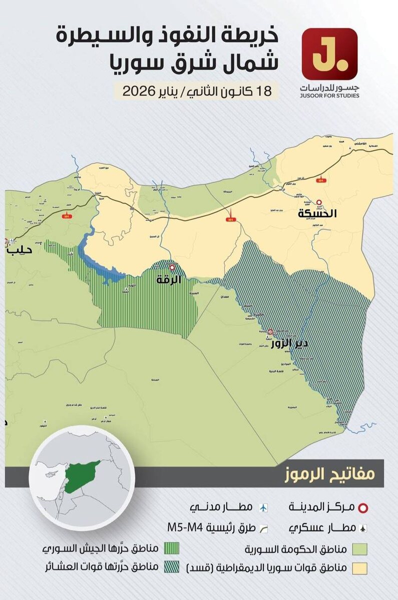 🇸🇾 Желтым цветом обозначена территория, остающаяся под контролем курдов из СДС. Зеленым цветом обозначена территория, захваченная боевиками.