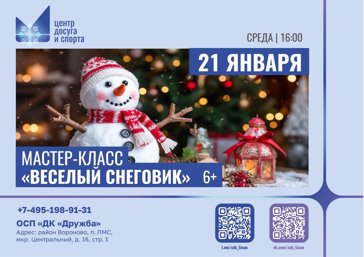 »! ✨ Дорогие ребята! Хотите, чтобы у вас дома поселился самый забавный и никогда не тающий снеговик? Тогда ждём вас на нашем творческом занятии! Собственноручно созданный «Весёлый снеговик» станет отличным украшением дома или добрым подарком для близких. Сделайте этот день ярким и заберите домой частичку зимнего волшебства! #анонсывороново #анонсытинао #новоститинао