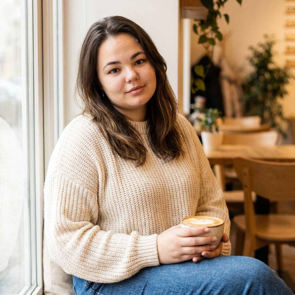 Используй загруженное фото для лица — точно сохрани ВСЕ черты: форму лица, глаза, нос, губы, брови, цвет волос, прическу. Женщина в уютном вязаном свитере оверсайз, джинсах, сидит у окна в светлом кафе. В руке чашка капучино. Естественный дневной свет из окна, размытый фон кафе. Настроение: комфорт и естественность. 50mm, f/1.8, теплые тона. #женские #мужские