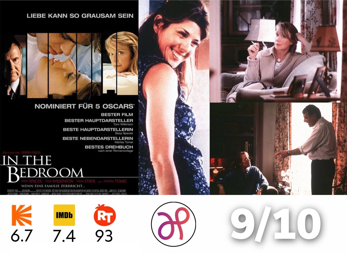 В спальне (2001) Экзистенциальная семейная драма о пожилой паре, которая потеряла самое дорогое, что у них было. Кино с оскароносными вайбами и нотками «Красоты по-американски». Неподражаемый Том Уилкинсон выдает лучшую свою роль, Сисси Спейсек как всегда ныряет в душу зрителя, а саундтрек пускает мурашки. Высококлассный «авторский» Голливуд, который сегодня уже не найти. ▶️ Трейлер