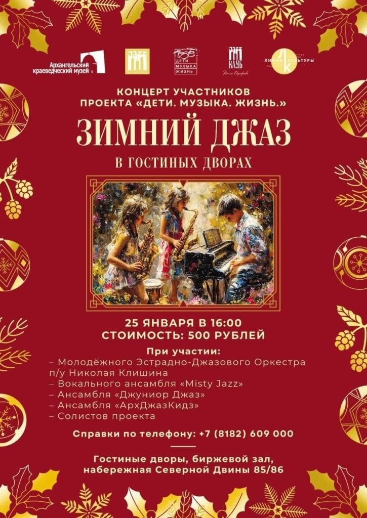 Музыка. Жизнь» 🎶 Вместе с профессиональными наставниками в мероприятии примут участие: молодёжный эстрадно-джазовый оркестр под управлением Николая Клишина, вокальный ансамбль «Misty Jazz», Ансамбль «Джуниор Джаз», ансамбль «АрхДжазКидз», «ХаусБэнд», Максим Анисимов (клавиши), Денис Попов (бас), Алексей Черняев (барабаны), Андрей Склёмин (гитара). Руководитель проекта — Мария Корель. В программе прозвучат джазовые вокальные и инструментальные композиции, а также советские мелодии в джазовых обработках. Проект реализуется при поддержке фонда «Линия Культуры» ПЦ Архангельск Джаз. 🎟 Билеты в кассе музея и на сайте 📍 Историко-архитектурный комплекс «Архангельские Гостиные дворы» 😊 Подписаться на «Радар Поморья»