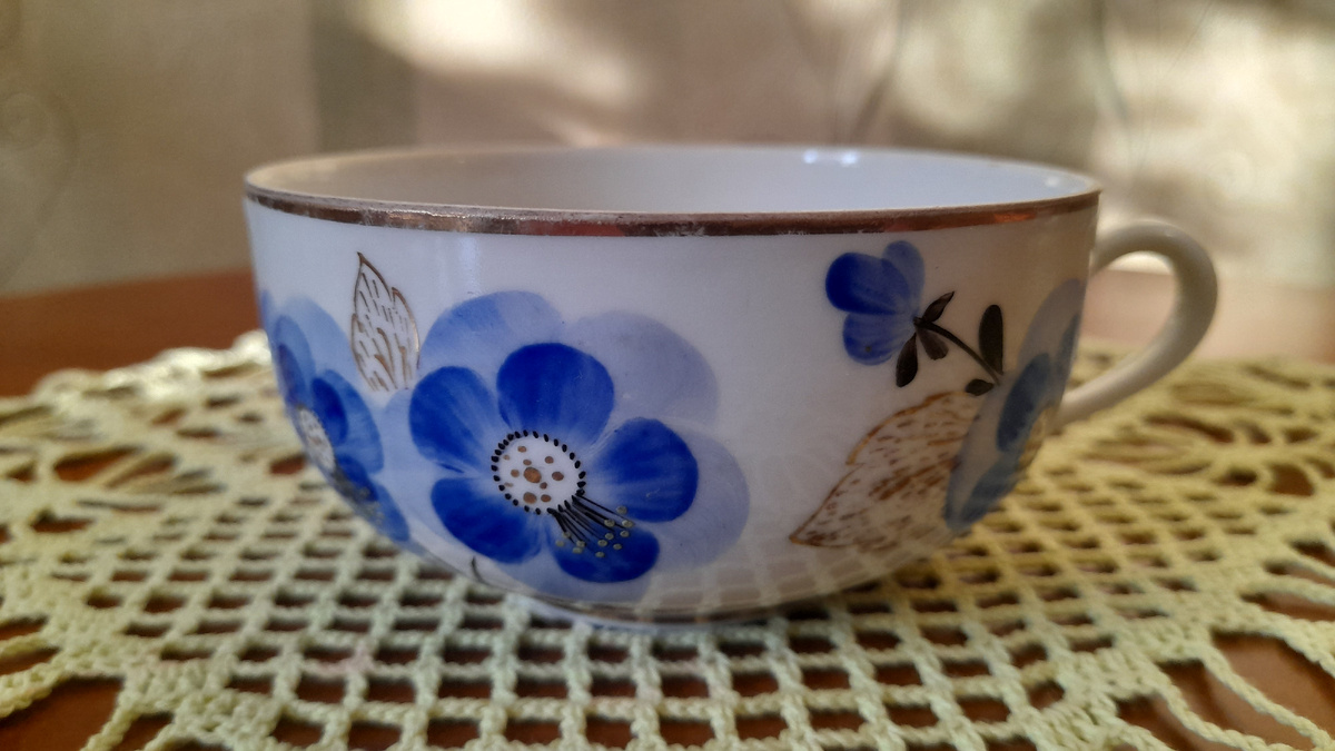 В первое моё посещение комиссионного магазина "Винтаж-кураж и антураж" я купила там вот эту очень понравившуюся мне чайную чашечку Ленинградского фарфорового завода. Их было 3 штуки, и все три с трещинками. Выбрала чашечку с наименьшими потерями. И жалею, что взяла только одну. Очень интересная форма и потрясающе красивая роспись. Дома сразу стала выяснять, что за сервиз, кто автор. Сервиз называется "Синие махровые цветы", создан в конце 40-х, производился в 50-60-х годах. Форма - "Репка", автор формы - Серафима Евгеньевна Яковлева. Автор росписи - Тамара Николаевна Беспалова-Михалёва (исполнитель росписи Лариса Ивановна Григорьева). Перед Новым годом искала на Авито подарок себе от дочери. Стала смотреть, что ещё можно купить из этого сервиза. Нашла на Авито сливочник за 2 тыс. рублей и тут же заказала, так как в других объявлениях их цена доходила до 4 тысяч. И вот, представьте, вечером я заказываю этот сливочник, а утром, открыв интернет, первое что увидела, такой же сливочник в п