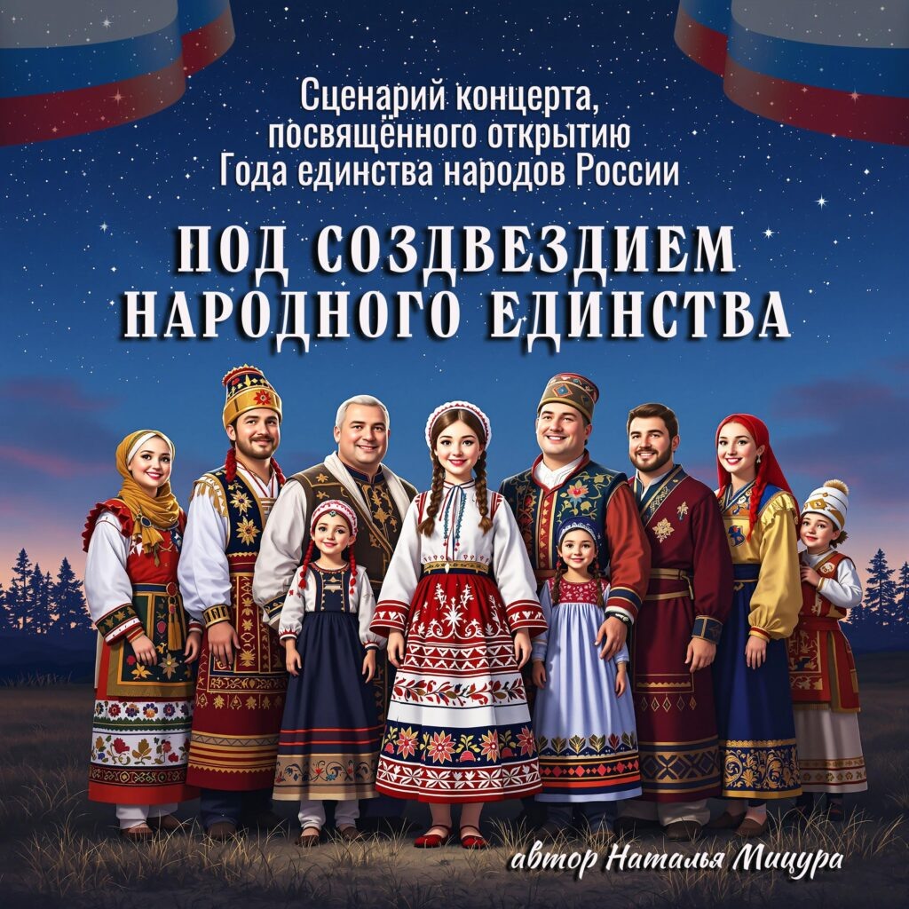 Мероприятие проводят двое Ведущих, при желании, объединив слова, можно оставить одного. Есть роль Юного Звездочёта, которую исполняет ребёнок (пол не имеет значения). Концерт проходит в сопровождении слайд-программы (идёт в архиве со сценарием). Однако при проведении мероприятия наличие экрана не обязательно (но желательно): слайд-программа лишь подчёркивает главную идею со звёздным небом и кульминацию сюжета. Звучит аудиофайл №1. Сцена празднично оформлена. На заднем плане большой экран, отображающий символику Года единства народов России (слайд №1). На сцену выходят Ведущие. Ведущий 1. Добрый день, дорогие друзья! Сегодня мы собрались здесь, чтобы открыть особенный год, который посвящён удивительной многоликости нашей великой Родины. Ведущий 2. По указу Президента Российской Федерации Владимира Путина 2026-ой год объявлен Годом единства народов России. Его главная цель – укрепить дружбу и взаимопонимание между народами, проживающими на территории нашей необъятной страны. Весь текст о