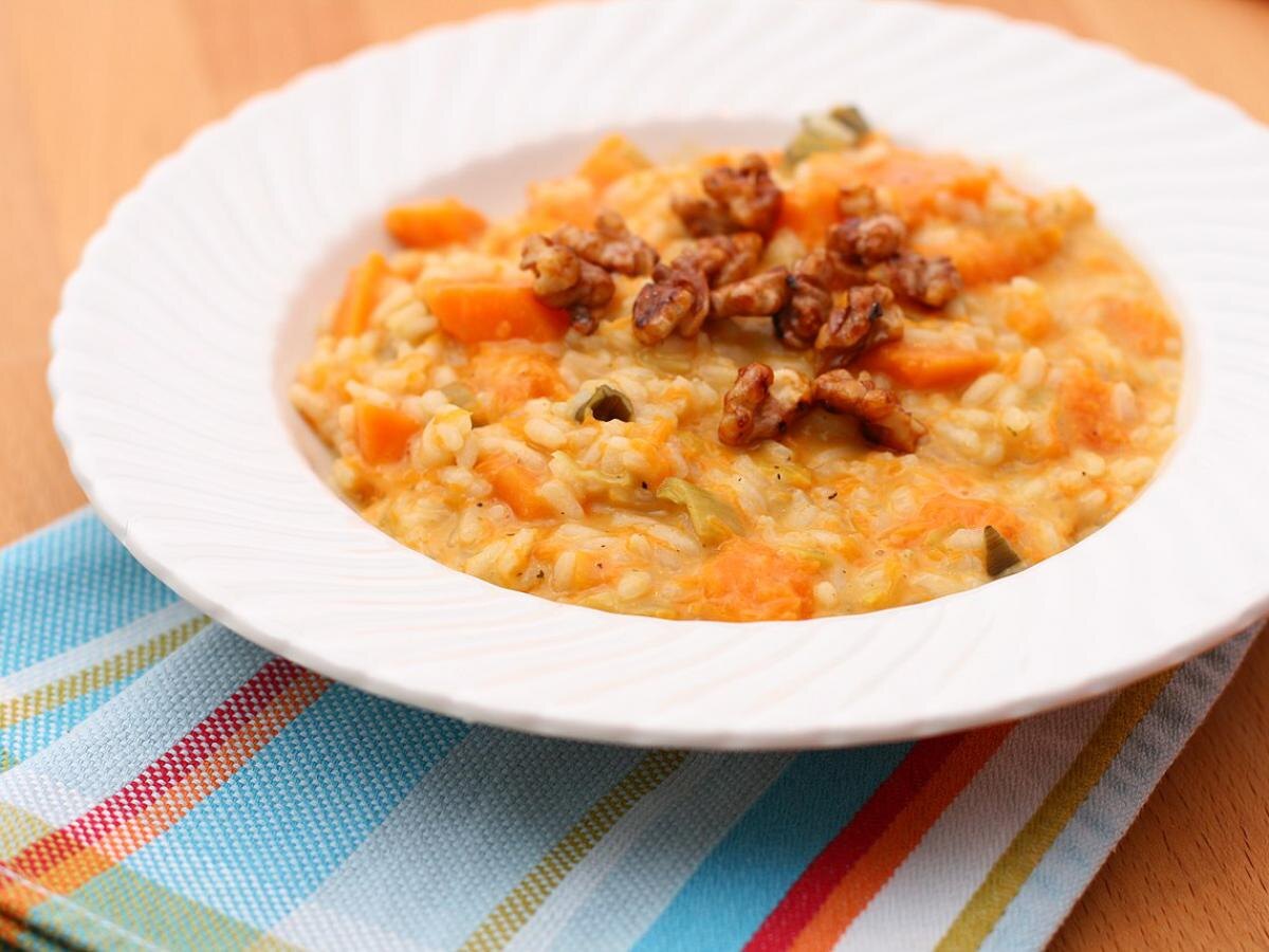 - В готовую горячую кашу аккуратно вмешайте кусочки запечённой тыквы и половину орехов.