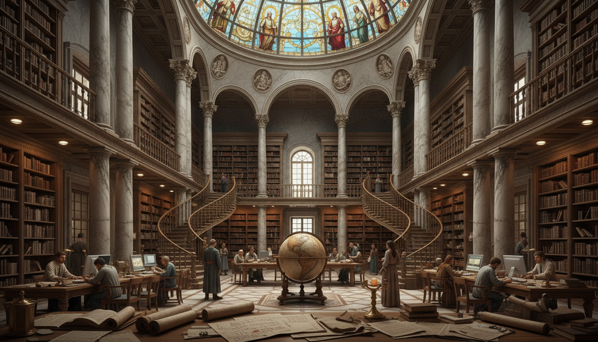 Представим такой сценарий. Библиотека не просто сохраняется — она процветает. Становится центром непрерывной научной традиции, передаваемой из века в век. Знания не теряются, а накапливаются, как снежный ком.