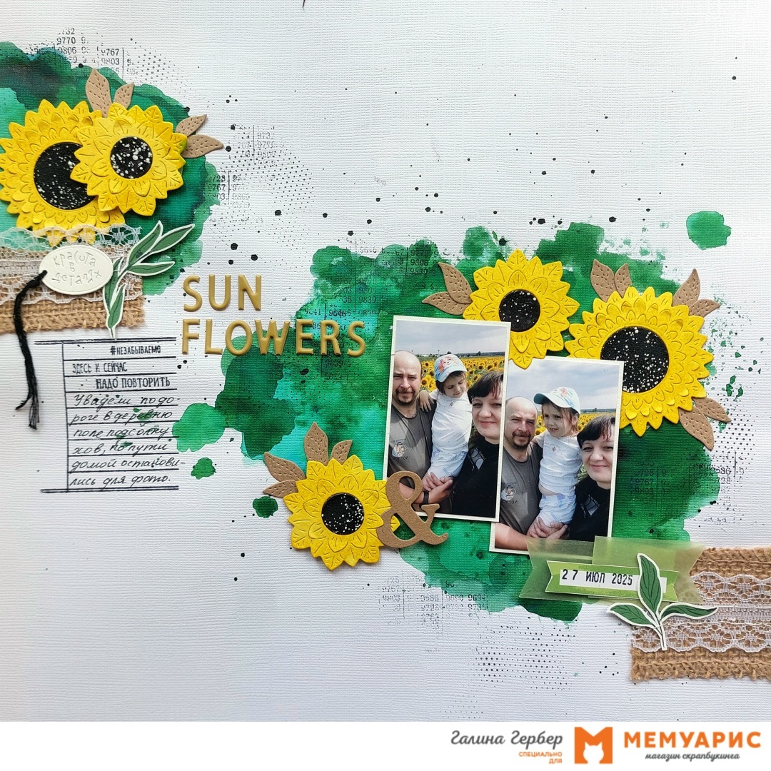 Привет-привет! Как то хвасталась в «болталке» Мемуарис кусочком летней странички, а теперь пришла показать вам её целиком. В основе белый кардсток. Я хорошенечко испачкала его сухими красками от Fractal paint и штампингом. Для своей странички выбрала красивый оттенок зелёного под названием «Хвойный лес». Сначала обычным целофановым пакетиком нанесла на лист разводы, потом доработала их кистью. Штампы использовала от Agiart: «Фоновый №3» и «Учебный архив». Главными героями на страничке (помимо нашей семьи) стали ярко-жёлтые цветы подсолнечника. Я думаю, вы узнали сет Mimicut «Свет мой зеркальце-2». Листочки я окрасила алкогольными чернилами, края и серединку покрыла пудрами для эмбоссинга от WOW!. Выбрала следующие оттенки: Primary Lemon Bella*s Forest. Добавила на страничку немного декора из коллекции «В детском мире. Девочки» от Golden Scrap, флажок вырубила из кальки с помощью набора Mimicut «Слова для души». Заголовок составила из Паффи-стикеров. Деревенский стиль (а фото было сдела