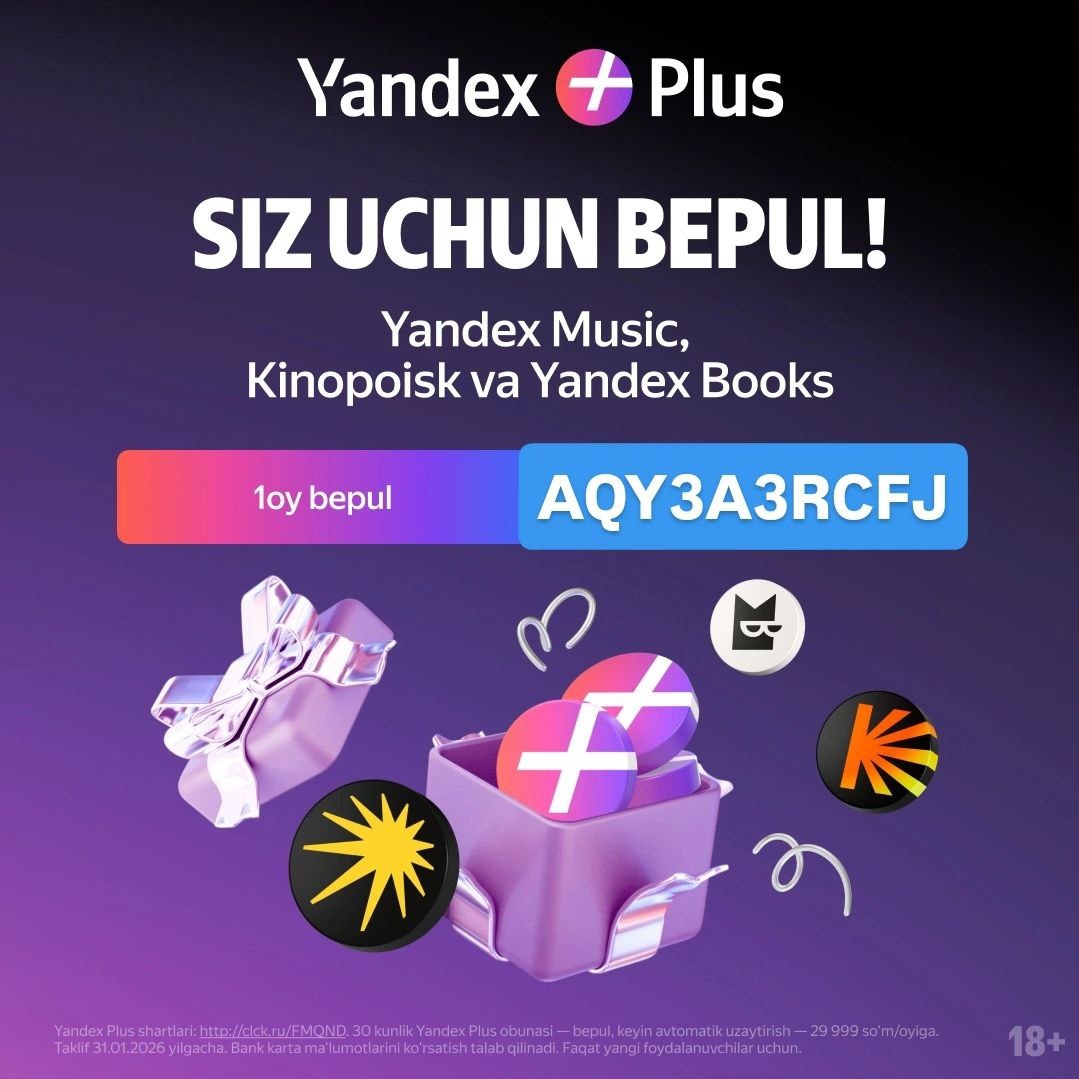 🔥 Agar sizning aktib obunangiz bo'lmasa, hozir Yandex Plus ni yoqish uchun eng zo'r payt: ✨ Yandex Music da millionlab musiqalarni reklamalarsiz tinglang. 🍿 Kinopoiskda minglab film va seriallarni to'xtovsiz tomosha qiling. 📚 Yandex Booksda kitoblarni o'qing va tinglang. 🍔 Yandex Go da sevimli taomllaringizni bepul yetkazib berish bilan buyurtma qiling. 🚕 Yandex Taksidan keshbek ballari orqali foyda bilan foydalaning. 🎁 Havola orqali o'ting https://ypls-eats.prfl.me/promokodmarkazi/opr03c va eksklyuziv taklif, 30 kunlik bepul obunani promokod 🔥AQY3A3RCFJ🔥 orqali yoqing. Aktiv obunaga ega bo'lmagan obunachlar uchun. Reklama. Batafsil —plus.yandex.uz 🛍 AKSIYAGA ULGURING! ✉️ Promokodlarimiz kanaliga obuna bo‘ling: https://t.me/PromokodMarkazi ➕ Kanalimizga ovoz berib qoʻllab yuboring: https://t.me/boost/PromokodMarkazi