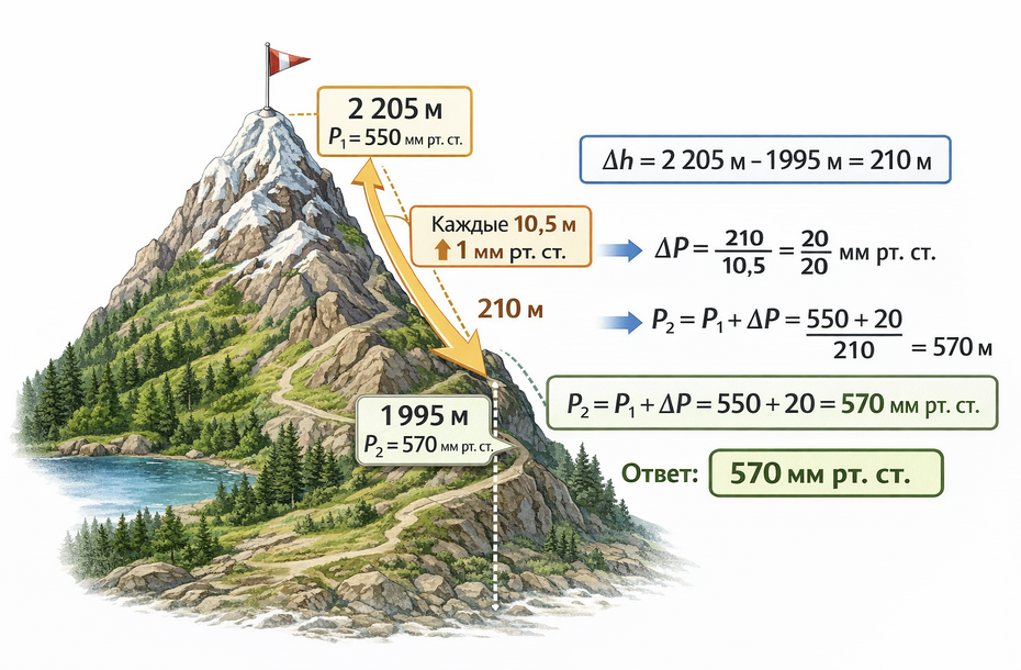 Условие задачи. Известно, что на высоте 2205 м над уровнем моря атмосферное давление составляет 550 мм рт. ст. Считая, что при подъёме на каждые 10,5 м давление уменьшается примерно на 1 мм рт. ст., определите атмосферное давление на высоте 1995 м над уровнем моря.