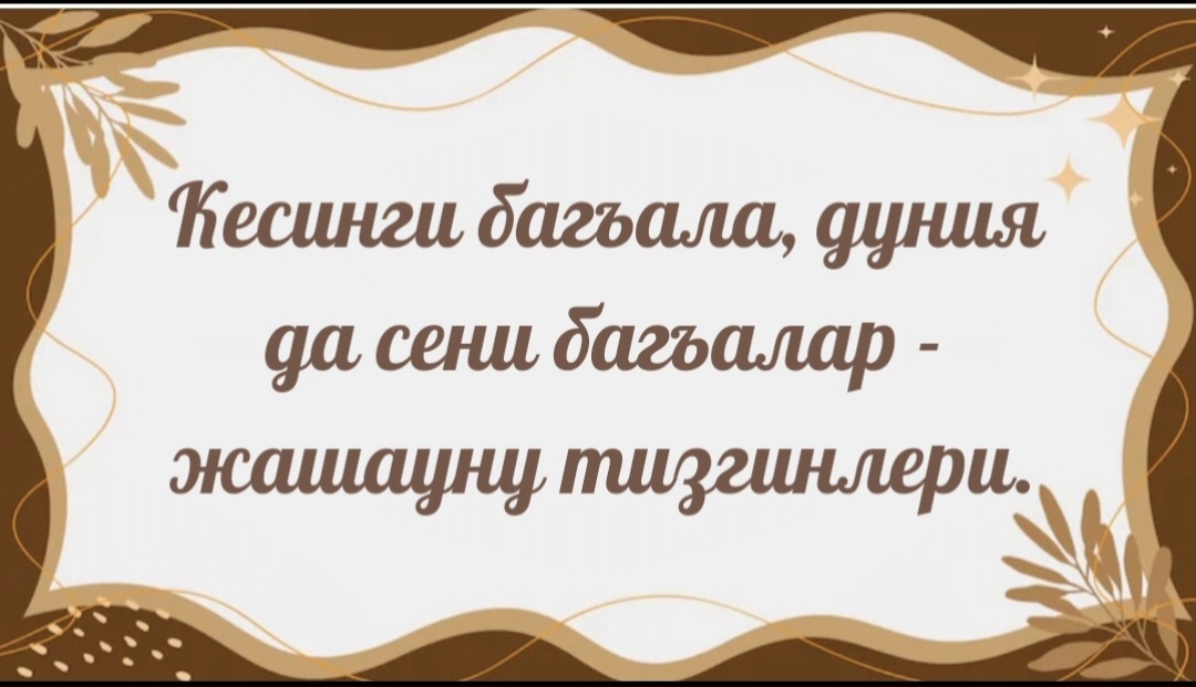 Ууакъ затлагъа алышынмагъыз. Бизни ата-бабаларыбыз: "Кесинги да, заманынгы да багъала", - деп юйретгендиле. Сиз тийишли болмагъан затха, ыразы болмагъыз. Хар ишге кесигизни низамыгъызны салыгъыз эм башхалагъа аны бузаргъа къоймагъыз. Сизни къылыгъыгъыз, сёзлеригиз, сайлауугъуз – была барысы да сизни ич магъанагъызны юсюнден айтыргъа керекдиле. Сиз кесигизге багъа бермесегиз, башхала да берлик тюйюлдюле. Керти байлыкъ - сыйлылыкъ, сабырлыкъ, тынчлыкъ эмда бу дунияда кесинги жеринги билген.