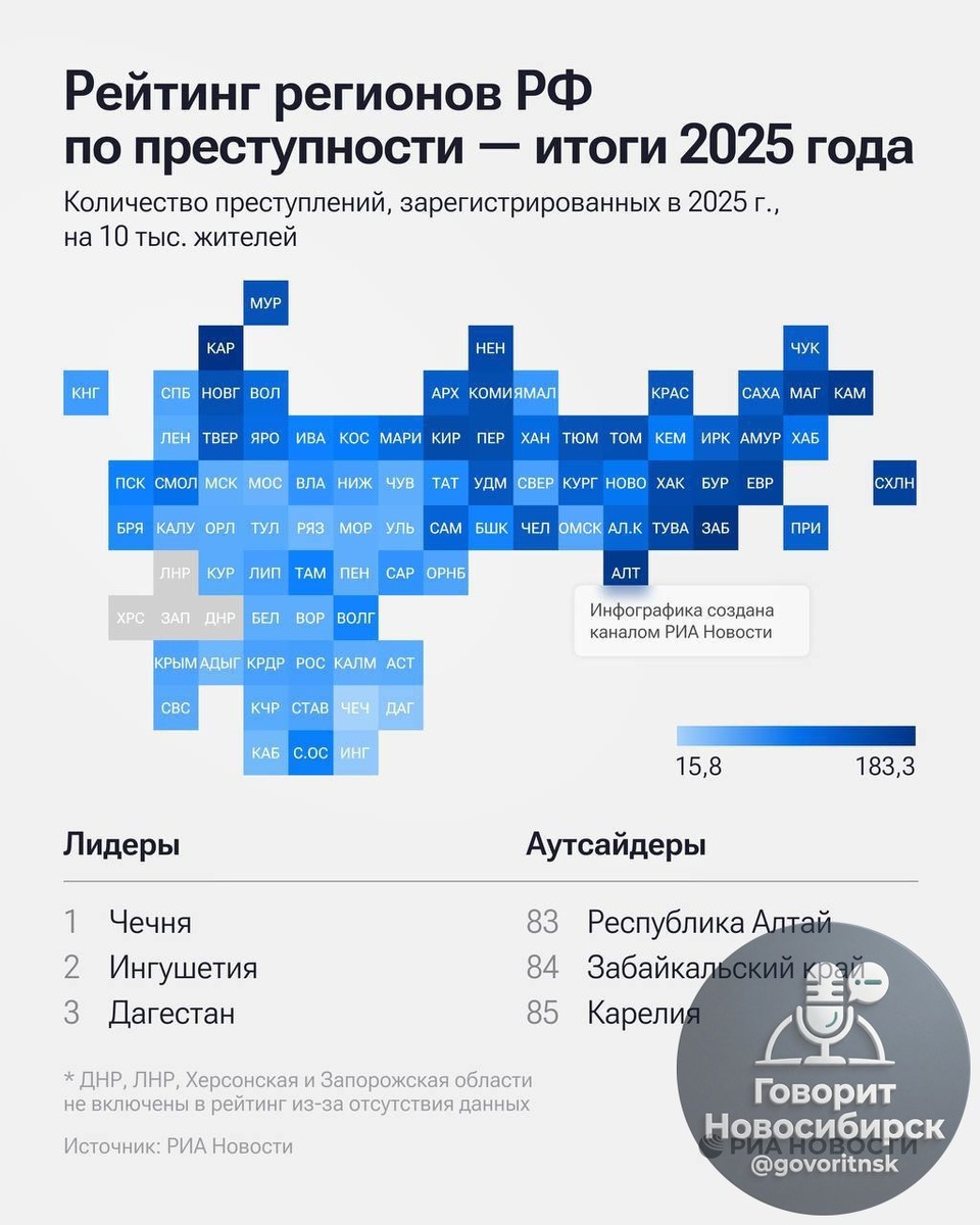 преступности, следует из данных МВД и Росстата, на которые ссылается «РИА Новости» Далее в рейтинге идут Ингушетия и Дагестан, тогда как наихудшие показатели официально регистрируемой преступности отмечены в Карелии и Забайкальском крае 😪 Новосибирская область в данном списке расположилась на 48 месте, что является отметкой чуть ниже середины. Говорит Новосибирск