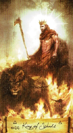 Он восседает на массивном каменном троне, держа в руках цветущий жезл, как скипетр. У его ног лежат живые саламандры, а на спинке трона вырезаны львы — цари зверей. Он одет в огненные одежды, его взгляд прямой, уверенный, пронизывающий. Он не просто сидит — он излучает власть, волю и созидательную энергию. За его троном — пустыня или равнина, но она кажется его владением, ожидающим приказа. Это не воин в седле, а правитель в своей неприступной крепости, откуда он управляет стихией огня.