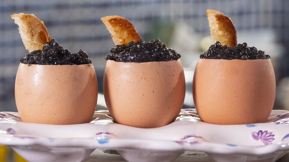 Ингредиенты (на 3 порции): - Яйца — 3 шт - Сливки — 2 ст. л. - Французский багет — небольшой кусочек - Чёрная икра — по вкусу - Соль, перец - Сливочное масло — немного Приготовление: 1. Аккуратно срезать верхушку яйца, вылить содержимое в миску. 2. Посолить, поперчить, добавить сливки → взбить вилкой. 3. Вернуть массу в скорлупу (оставить место). 4. Поставить яйца на фольгу-подложку в пароварку (или над кастрюлей с кипятком) → готовить на пару 3 минуты. 5. Багет нарезать гренками, обжарить на сливочном масле. 6. В каждое яйцо положить кусочек масла, гренку и щедро чёрную икру сверху. Готово! Роскошный завтрак для королей! Зовите величество к столу!