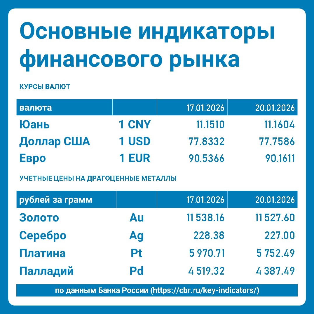 Основные индикаторы финансового рынка на 20.01.2026 #cbr_key_indicators Бизнес в Новороссийске По данным Банка России Ключевые показатели Инфляция Цель по инфляции - 4,0% Декабрь 2025 - 5,6% Показатель инфляции отражает темп прироста потребительских цен к соответствующему месяцу предыдущего года Ключевая ставка с 22.12.2025 - 16,00% Основные индикаторы финансового рынка Курсы валют на 20.01.2026 Юань - 11.1604 Доллар США - 77.7586 Евро - 90.1611 Учетные цены на драгоценные металлы на 20.01.2026 Золото - 11 527.60 Серебро - 227.00 Платина - 5 752.49 Палладий - 4 387.49 Подписаться на Telegram канал Бизнес в Новороссийске Навигация в закрепленном сообщении 🧭 ㅤ