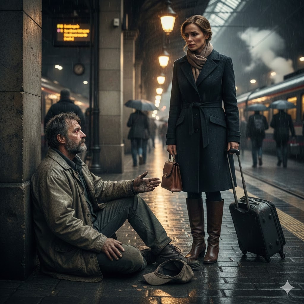Дождь усилился, превращая вокзальную площадь в серое зеркало, отражающее неоновые вывески и суету прохожих. Елена смотрела на человека, сидящего у её ног, и не чувствовала того торжества, которое, казалось бы, должна была испытать обманутая женщина. Вместо жгучей радости мести в груди разливалась странная, тяжелая пустота.