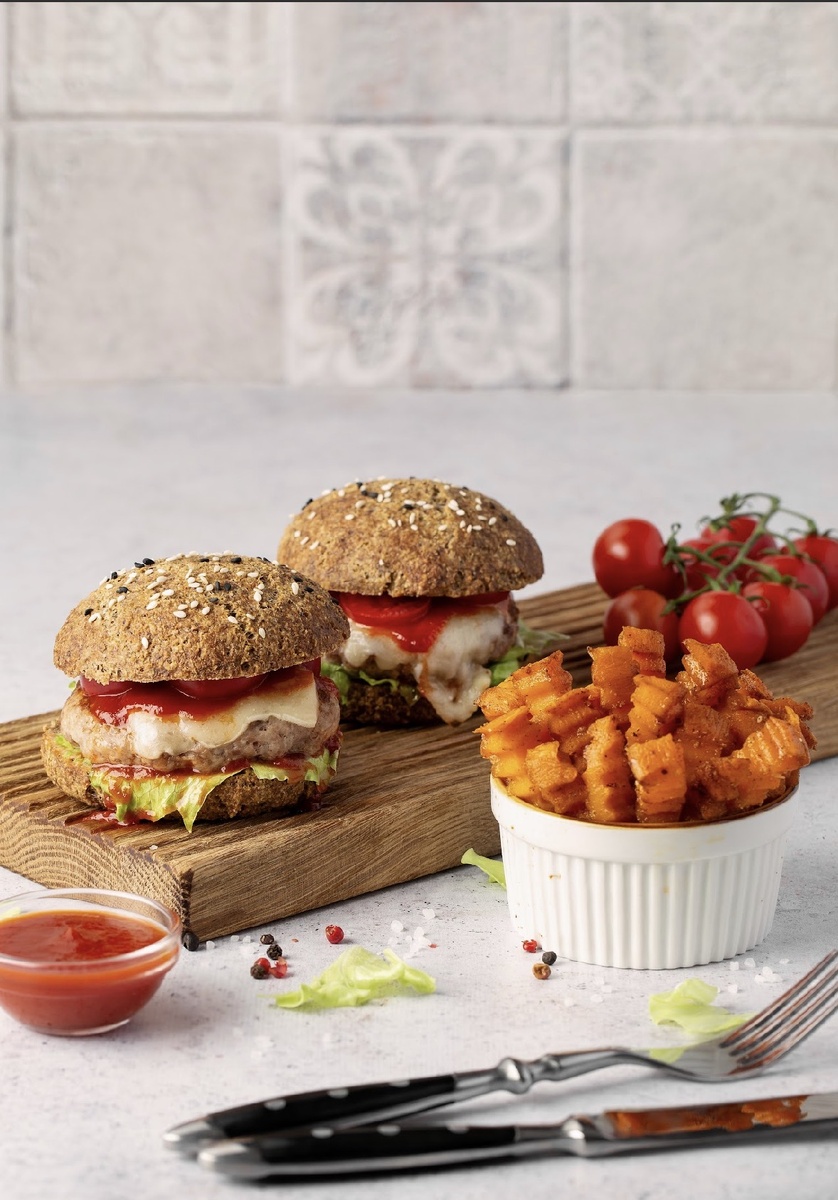 Мягкие булочки с клетчаткой, сочное мясо без лишнего жира, томатный соус без сахара.