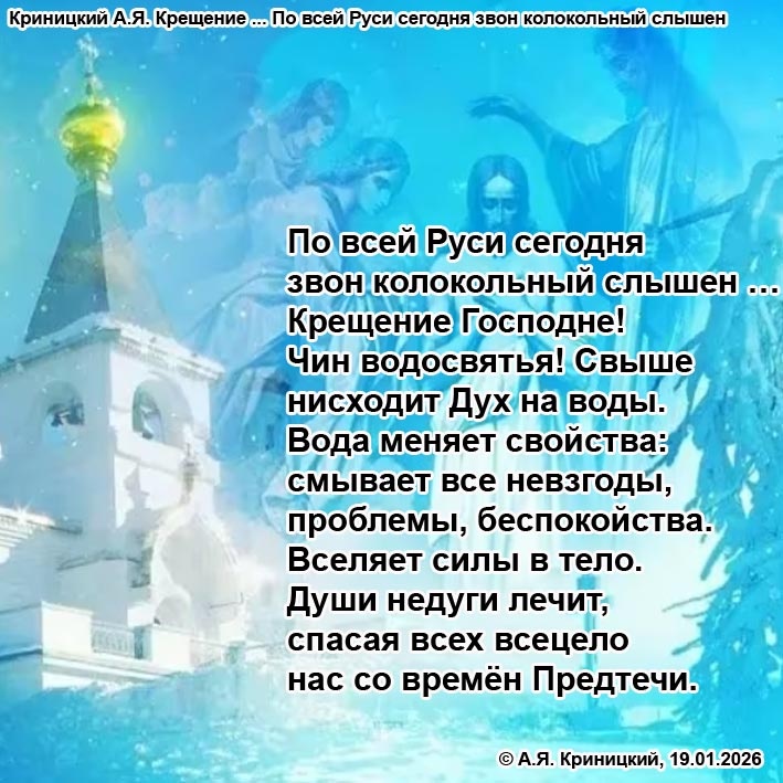 С праздником Крещения Господня! Пусть святая вода очистит душу и сердце, наполнит жизнь светом и благодатью, подарит Благословение Божье, укрепляющее веру и надежду.... КРЕЩЕНИЕ ... ПО ВСЕЙ РУСИ СЕГОДНЯ ЗВОН КОЛОКОЛЬНЫЙ СЛЫШЕН © А.Я. Криницкий, 2026 Смотрите, слушайте, подписывайтесь: Авторское прочтение стихотворения на канале Rutube: https://rutube.ru/video/faf1e63ceec85469c8484bdb1a222348/ Авторское прочтение стихотворения на канале YouTube: https://youtu.be/InQ9i_VOVxg Стихотворение на сайте СтихиРУ: https://stihi.ru/2026/01/19/1034 Стихотворение на авторском телеграм канале: https://t.me/Krinitski/440 Другие стихи, посвященные празднику Крещению: https://stihi.ru/2021/01/18/1067 ...