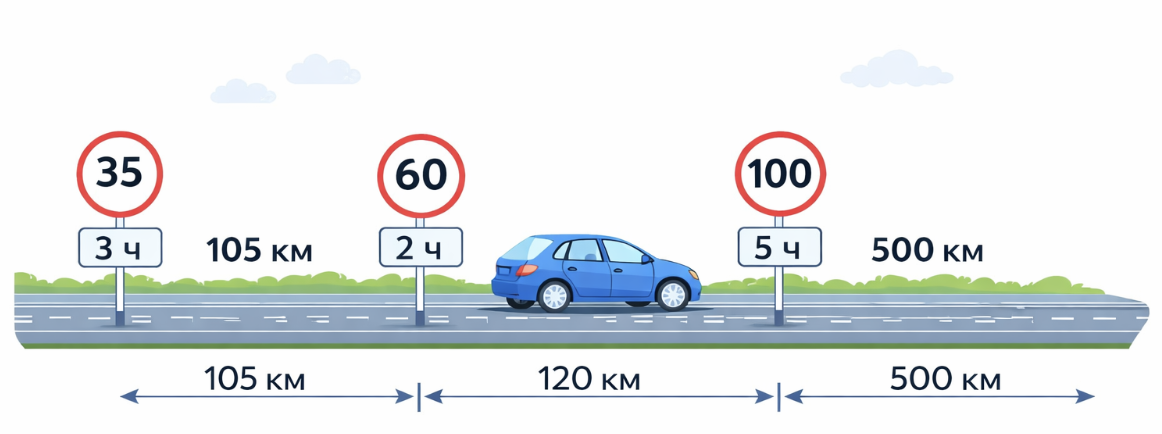 Автомобиль проехал три участка: Общее время: 3 + 2 + 5 = 10 ч Общий путь: 105 + 120 + 500 = 725 км Средняя скорость: 725 ÷ 10 = 72,5 км/ч Ответ: 72,5 км/ч