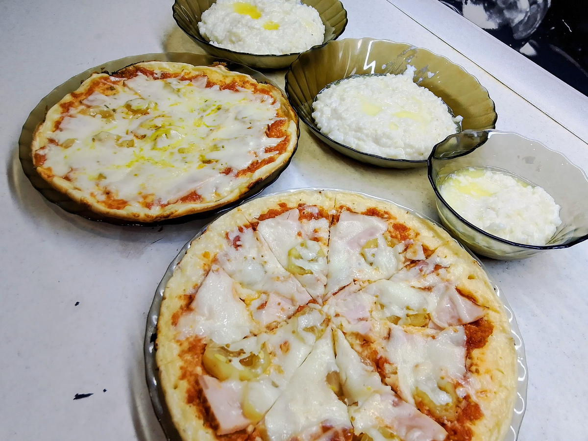 На завтрак сварила кашу дружба (пшено+рис), дала ей напариться да быструю пиццу на сковороде сделала