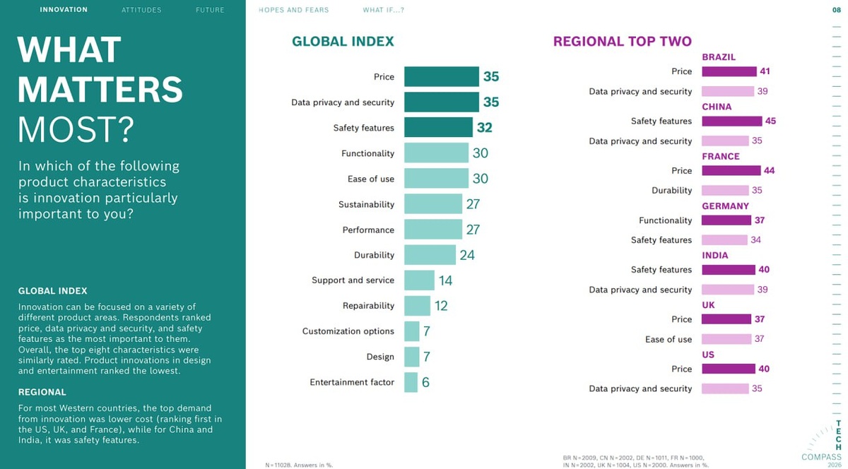 В отчете Tech Compass 2026 аналитики выяснили, что потребители по всему миру считают самыми важными характеристиками продукта цену, конфиденциальность и безопасность данных (по 35%). Дизайн оказался в самом конце списка приоритетов. «Альянс Цифровых Лидеров в стройке» в MAX