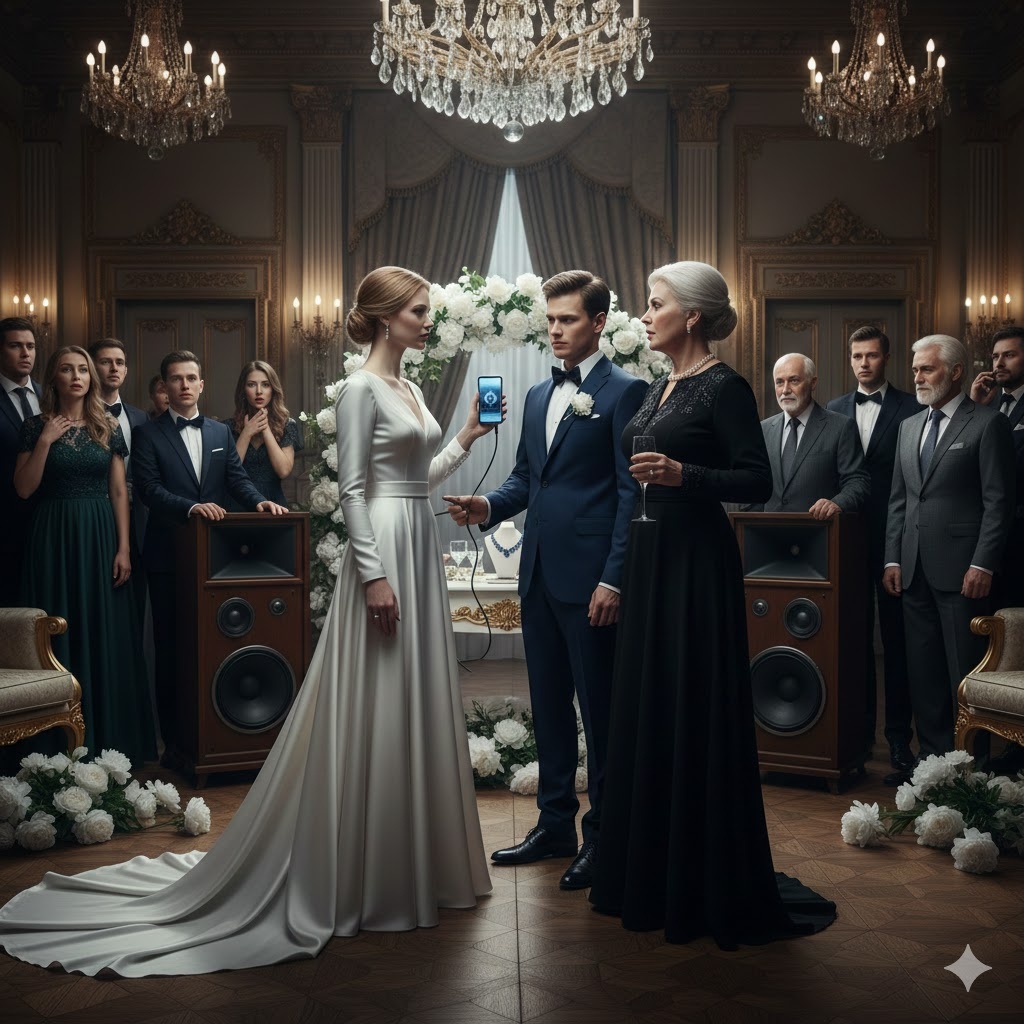Она не кричала. Её голос звучал удивительно спокойно, перекрывая шепот в последних рядах. Елена засунула руку в потайной карман свадебного платья — деталь, которую она попросила портниху добавить в последний момент — и достала мобильный телефон.