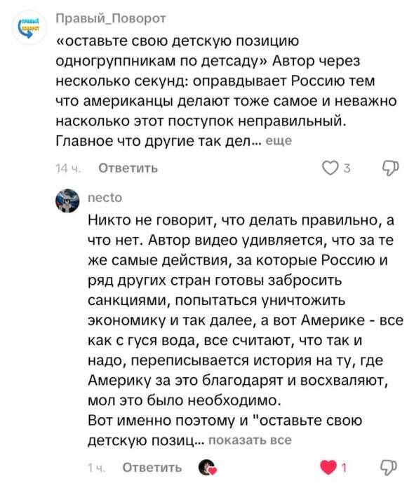 клипов в ошибках, несостыковках и несостоятельности. Зачастую безосновательно, благодарен вам за ваши комментарии! Но ведь все они цепляются за скелет своей позиции. Основу той позиции, которую рассказывает их сторона, будь это соевый раф на кокосовом или незалежный воин света. Я абсолютно спокоен, следуя примеру зарубежной угрозы, публичен в своих намерениях и использовании зеркальных и аналогичных манипуляций в продвижении определенных национальных нарративов в этой информационной войне. Попытка уличить меня в «нелогичности», «нарушении логики» среди клипового формата очень забавляет, ведь я применяю ту же логику, что и в контенте, который им рекомендуется с «близкими им взглядами». В этой формуле изменён только конечный нарратив и итог — мнение, к которому должен прийти сомневающийся или закрепить убеждённый. ...