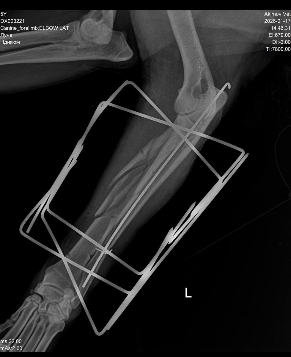 Добрый вечер ! Расскажу немного про Луну. Сделали операцию - остеосинтез предплечья. Прогнозы осторожные, но уже положительные. Потихоньку гуляем и пользуемся лапой. Обработки и таблетки по расписанию. Далее по плану у нас снятие швов, приемы, ежемесячные снимки, реабилитация. Покой и ограничение нагрузок по умолчанию🧘🏻♀️ #Луна конечно не очень рада. Скакать было веселее. Верю что общими усилиями она продолжит свой может не такой как раньше активный быт. И еще полноценно поплаваем в любимом водоеме, погуляем по лесу и поиграем в ее любимый мячик. Будем стараться ! На последнем изображении снимок конструкции Всем спасибо беспокойство и поддержку 🙏🏽