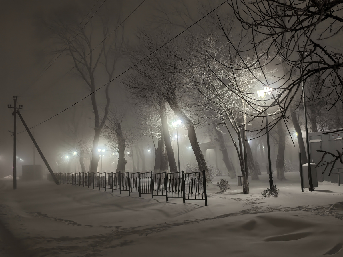 Ночью на город упало облако. Все укрыто белым инеем. Деревья, провода, все белое. Легкая дымка и темнота скрывают подробности. Ощущение сказки наполняет душу. С уборкой снега у нас не так, чтобы хорошо. Дело для Крыма непривычное, людей и техники не хватает. Но проехать везде можно, пройти тоже. Рано утром пошёл на праздничную службу. До Успенского храма идти почти три километра. Не смог пройти мимо Горсада, уж очень там красиво. Увязалась собака с оборванной цепью. На уговоры идти домой не реагировала. Здоровалась со всеми собаками за заборами. Так и шли лая на всех. У храма купель есть, там вчера желающие окунались, сегодня тоже кто хочет. После службы Великое освящение воды у древнего источника. Крещенская вода называется Агиасма, она обладает особой силой. Но это не магия а Благодать, и лишь в соединении с верой она освящяет и человека и все вокруг. Кошка заждалась, она не хочет пользоваться личной дверью от которой пахнет размораживателем замков. Его пришлось использова