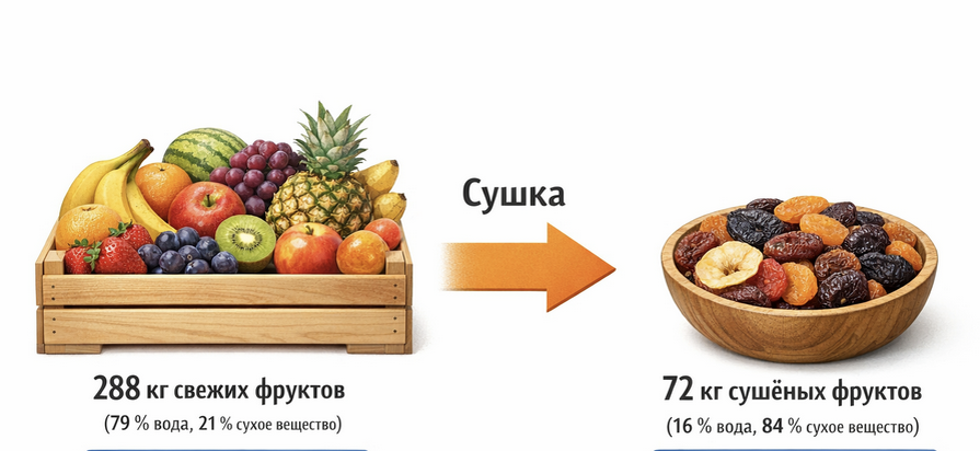 💡 Количество сухого вещества не меняется Вода уходит, а сухая часть остаётся той же. Свежие фрукты содержат 79% воды, а высушенные - 16 %. Сколько требуется свежих фруктов для приготовления 72 кг высушенных фруктов?