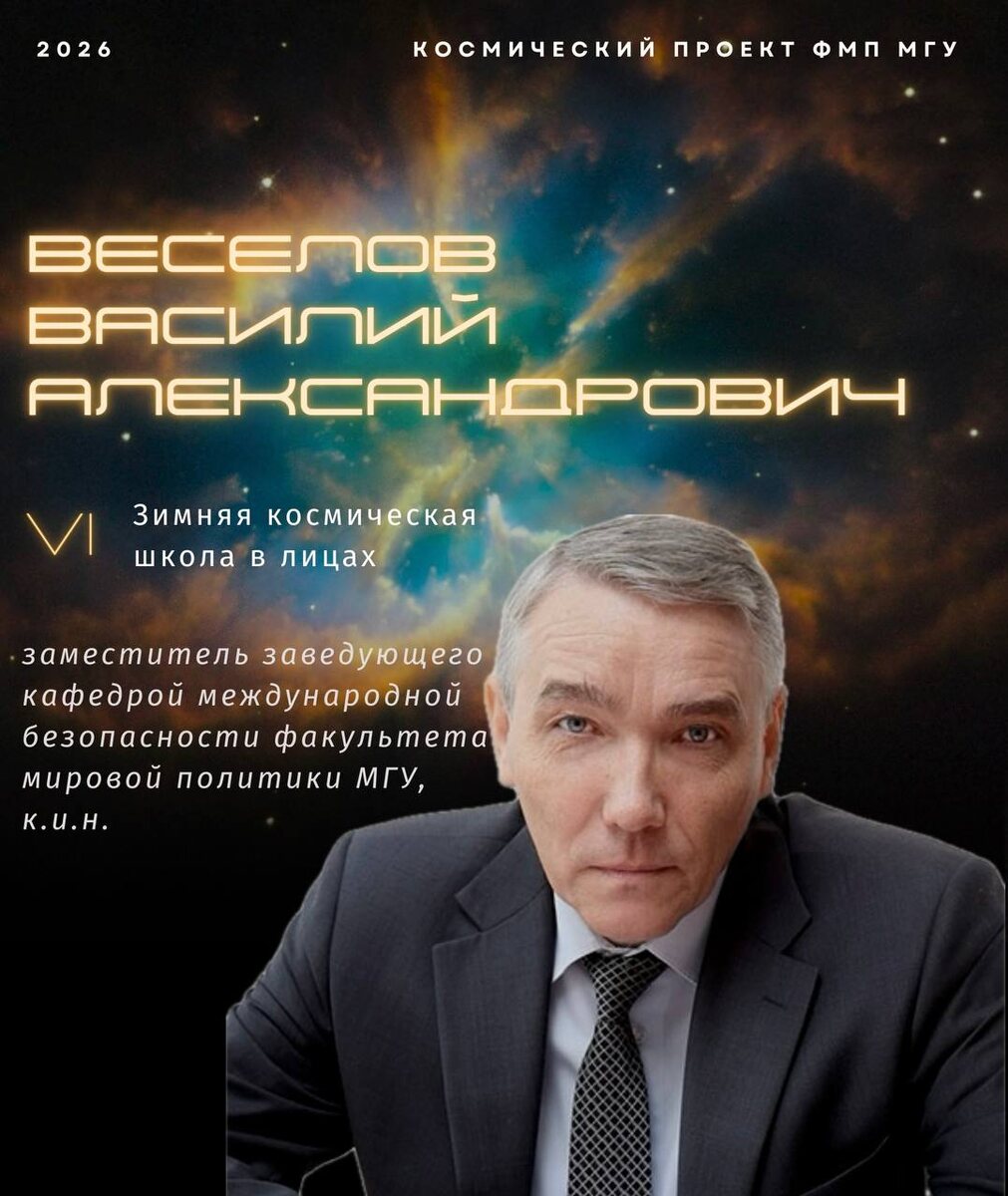 До начала главного космического события этой зимы осталось ровно 2️⃣ недели — самое время начать знакомиться с группой наших космических экспертов! Мы безмерно рады открыть рубрику вместе с Василием Александровичем Веселовым – координатором и идейным вдохновителем Зимней космической школы! 👨 Василий Александрович: ✨заместитель заведующего кафедрой международной безопасности ФМП МГУ; ✨кандидат исторических наук; ✨эксперт Российского совета по международным делам. ♥️ Василий Александрович откроет зимнюю школу и расскажет нашим участникам о развитии отечественной ракетно-космической отрасли. Напоминаем, что в этом году школа приурочена к 80-летию отечественной космонавтики и 65-летию первого полета человека в космос, совершенного Юрием Алексеевичем Гагариным. 🚀 Научные интересы Василия Александровича лежат в плоскости космической безопасности и охватывают такие сферы, как обеспечение стратегической стабильности, проблема милитаризации космического пространства и др. 👨🚀 Публикац