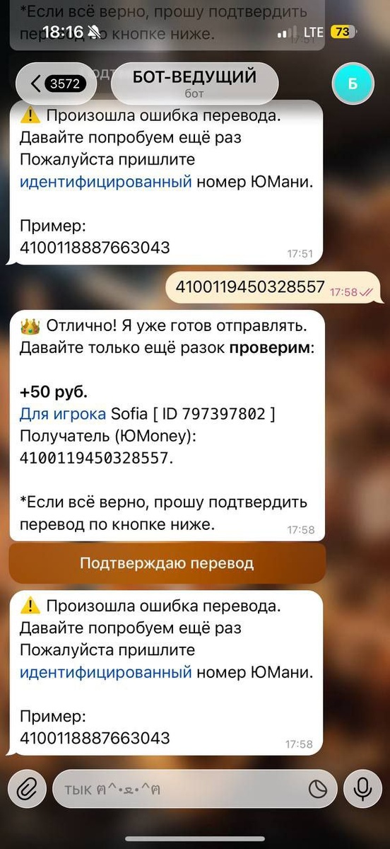 Смотрите, какая ситуация. Если у вас при выводе бот пишет ошибку, то стоит первым делом убедиться что у вас идентифицированный кошелёк. На анонимные кошельки переводы не осуществляются даже частными лицами в РФ (насколько я знаю). Как я полагаю, это такой закон даже. Ну, чтобы случайно не перевести террористам и не заехать за колючку. Но тут не уверен, может и нет закона. Идентификация делается быстро, за 10 минут я делал. При условии, что у вас есть полностью подтверждённые госуслуги. А то очень хочется, чтобы призы всё-таки достигли своих владельцев)