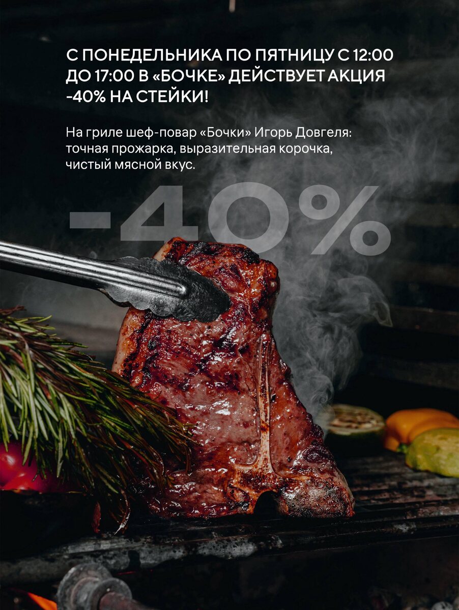 Новую неделю предлагаем начать с хороших новостей — в «Бочке» возобновили акцию -40% на стейки в будние дни с 12:00 до 17:00