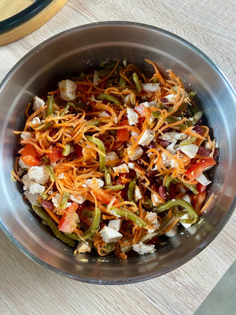 Эти салаты просты в приготовлении. К тому же они готовятся из обычных бюджетных продуктов, которые у большинства всегда есть под рукой. И не смотря на то, что они ну очень разные, каждый из них найдёт своего поклонника:) Первый салат действительно очень сытный, вкусный... и (бонусом) полезный! Ингредиенты: - банка фасоли красной - банка фасоли стручковой (можно просто 2 банки красной) - упаковка корейской моркови - курогрудь отварная - сладкий красный перец - крымский/ялтинский лук (сладкий) - петрушка (желательно, но не обязательно) Заправка на ваш вкус, впрочем, игра с ингредиентами, тоже🙂 Кто-то любит с майонезом, а кто-то худеет и употребляет без заправки вовсе - корейская морковка делает своё дело и вкус совсем не пресный. А вот и второй, ещё более лёгкий рецепт, который подойдёт даже тем, кто считает калории, но и мужчин вполне насытит. В целом, основа походит на основу оливье. Ингредиенты: - отварной картофель - отварная морковь - соленые (или маринованные) огурцы - зеленый го
