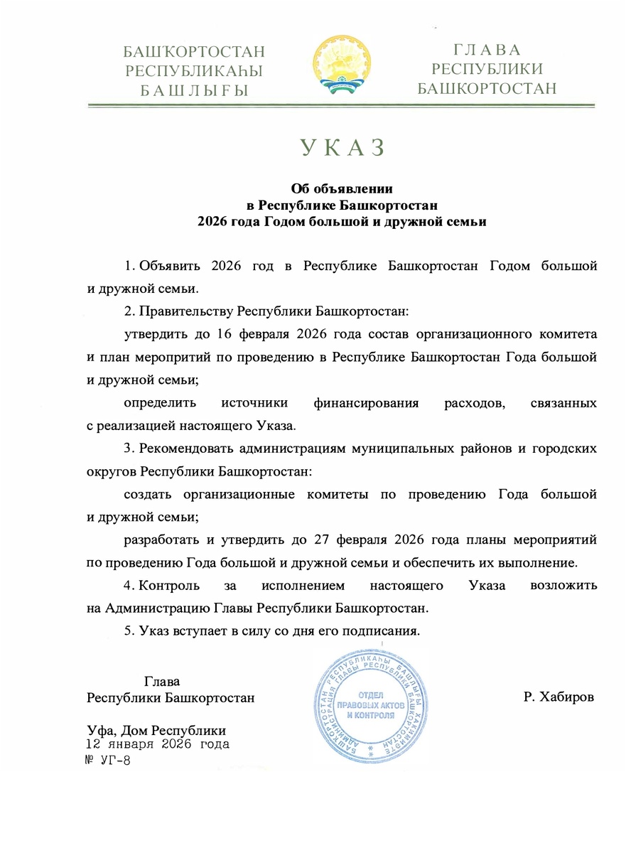 Соответствующий указ главы республики Радия Хабирова опубликован сегодня, 19 января, на портале правовой информации. Правительству республики поручено до 16 февраля утвердить состав оргкомитета и план мероприятий по проведению Года большой и дружной семьи.