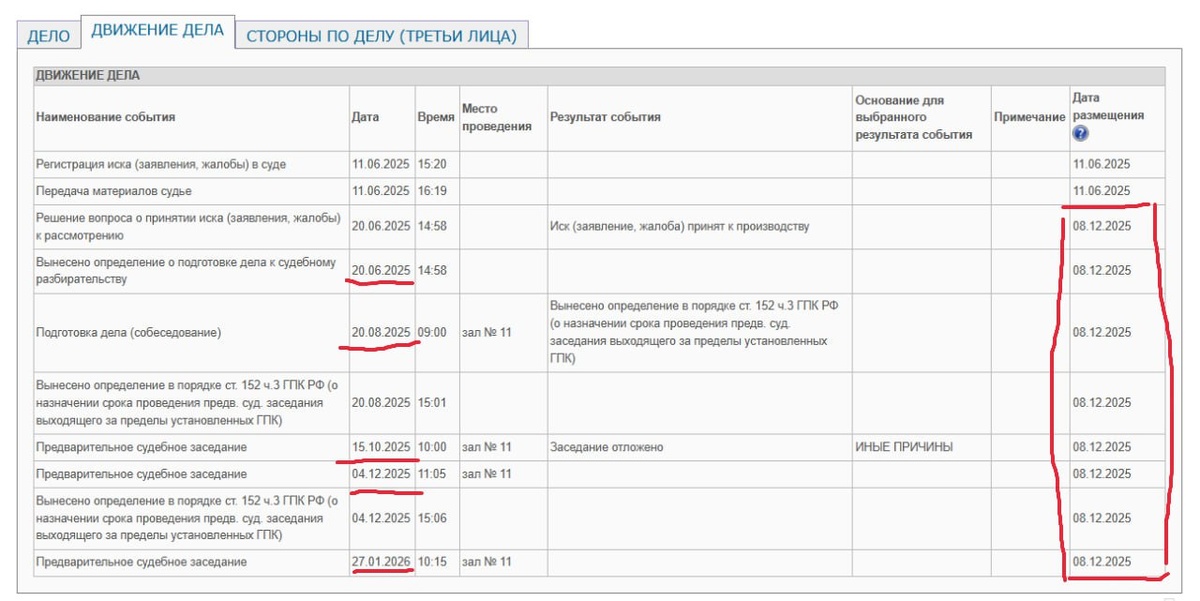 До 2025 года с Всеволожским судом дел не имела и даже не слышала о нем отзывов коллег. Но как только подала иск в мае 2025, мне стали попадаться рилсы о нем. О нем же вскользь упоминали на различных курсах по повышению квалификации😅 Буквально намедни - 15.01, на лекции по наследственному праву 🧐 от спикера я вновь услышала о работе этого чудесного суда. Кратко: закинули иск и с 11.06.2025 он завис в суде, я даже дозвонилась до канцелярии😂, но меня перенаправили к помощнику судьи, который трубку ни разу не удосужился взять. Чисто случайно, доверитель заходит на сайт в конце декабря и видит такую чудесную картину. Практически четвертое предварительное заседание назначили, хорошо, что в иске не отказали😂 🤩"Семейные споры и медиация" MAX | @law_mediator